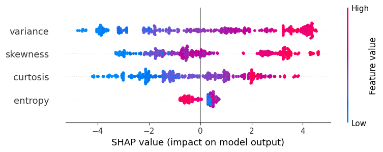 -3.11327 -1.48426 1.06169 -0.700595We can then use the SHAP library in Python to visualize these results in whichever way we prefer. For example, the following code creates a summary plot: