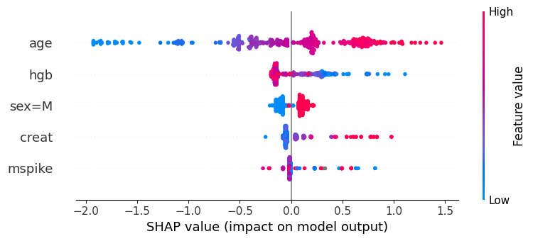 -0.26166 0.29492 0.19171 0.81775 0.18365We can then use the SHAP library in Python to visualize these results in whichever way we prefer. For example, the following code creates a summary plot: