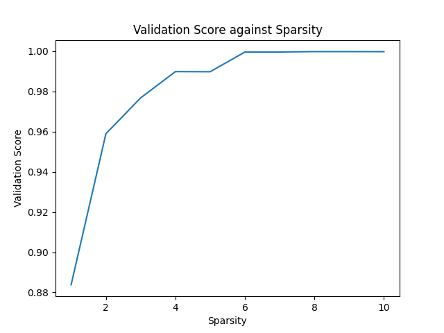 We see that the quality of the model quickly increases with as features are adding, reaching AUC 0.98 with 3 features. After this, additional features increase the quality more slowly, eventually reaching AUC close to 1 with 6 features. Depending on the application, we might decide to choose a lower sparsity for the final model than the value chosen by the grid search.