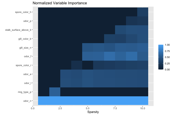 [ reached 'max' / getOption("max.print") -- omitted 82 rows ]We can also look at the feature importance across all sparsity levels:
