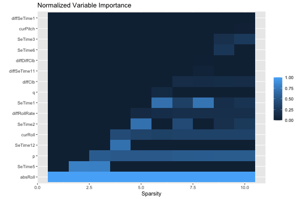 [ reached 'max' / getOption("max.print") -- omitted 10 rows ]We can also look at the feature importance across all sparsity levels: