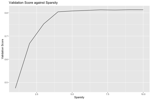 The model selected a sparsity of 9 as the best parameter, but we observe that the validation scores are close for many of the parameters. We can use the results of the grid search to explore the tradeoff between the complexity of the regression and the quality of predictions: