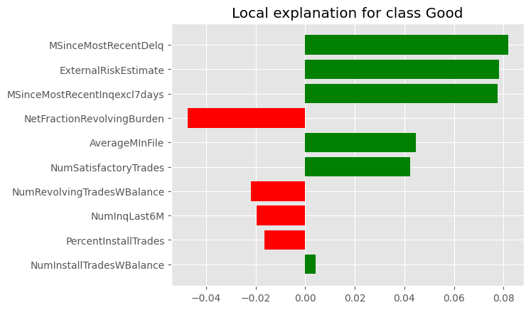 Lime attempts to explain the local sensitivity of the prediction to the features in the dataset. Here it tells us that the three most significant factors in the prediction for this point are the time since the most recent delinquency, the external risk estimate, and the time since the most recent inquiry (and increasing each of these values will push the prediction towards Good).