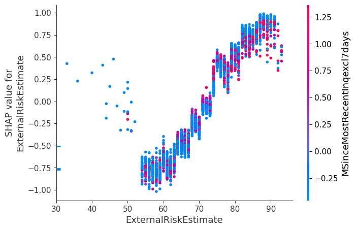 This plot shows us that the external risk estimate is largely linearly correlated with its impact on the predicted outcome. From the color scale, the plot shows there is no interaction effect between the external risk estimate and the time since the most recent inquiry, as the trend in the plot is independent of color (despite the time affecting the external risk score). In comparison, by inspecting the trees output, we see that there are signs of interactions between these two variables as they are both used in different locations of the tree with different thresholds each time, indicating that each feature's importance to predictions might be dependent on the value of the other.