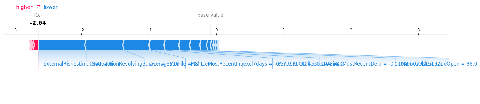 We see that from the SHAP explanation that the most significant feature pushing the prediction towards Bad is the external risk estimate. This is followed by the utilization of revolving credit lines and the average age of the credit file. There are over ten additional features with importances assigned in the explanation, pushing the prediction in both directions.