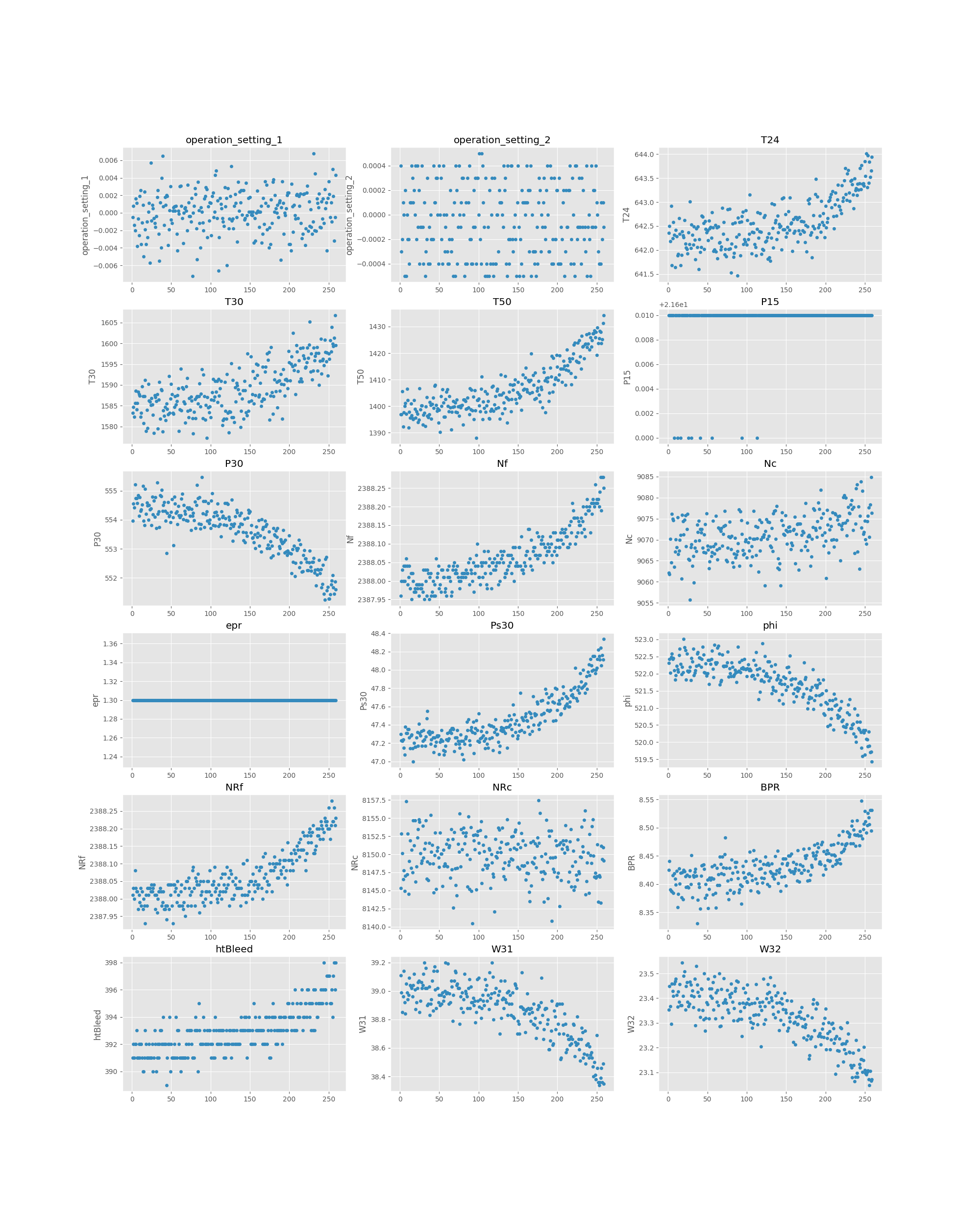 - Each time series is from a different engine, i.e., the data can be considered to be from a fleet of engines of the same type.